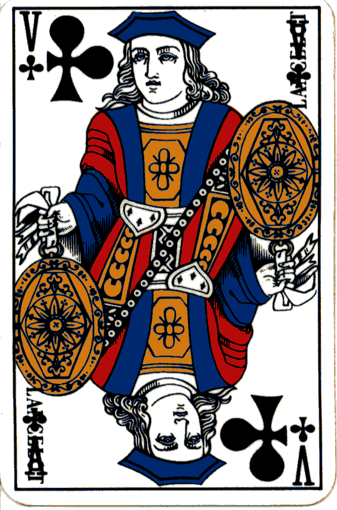 Called “Lancelot” on the French deck, probably after the Arthurian hero. He holds a shield (?) attached to a string. He faces forward, a little to the left. On the English deck, he holds an unreadable object (originally an arrow). There is a feather sticking from his hat. He faces forward, a little to the right.