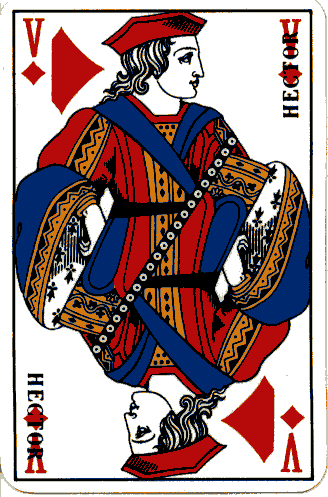 Called “Hector” on the French deck, possibly not after the Trojan hero, but perhaps after a companion (brother?) of Lancelot. He faces right, and is seen in profile. On the English deck, he holds a sword. He faces forward, a little to the left.