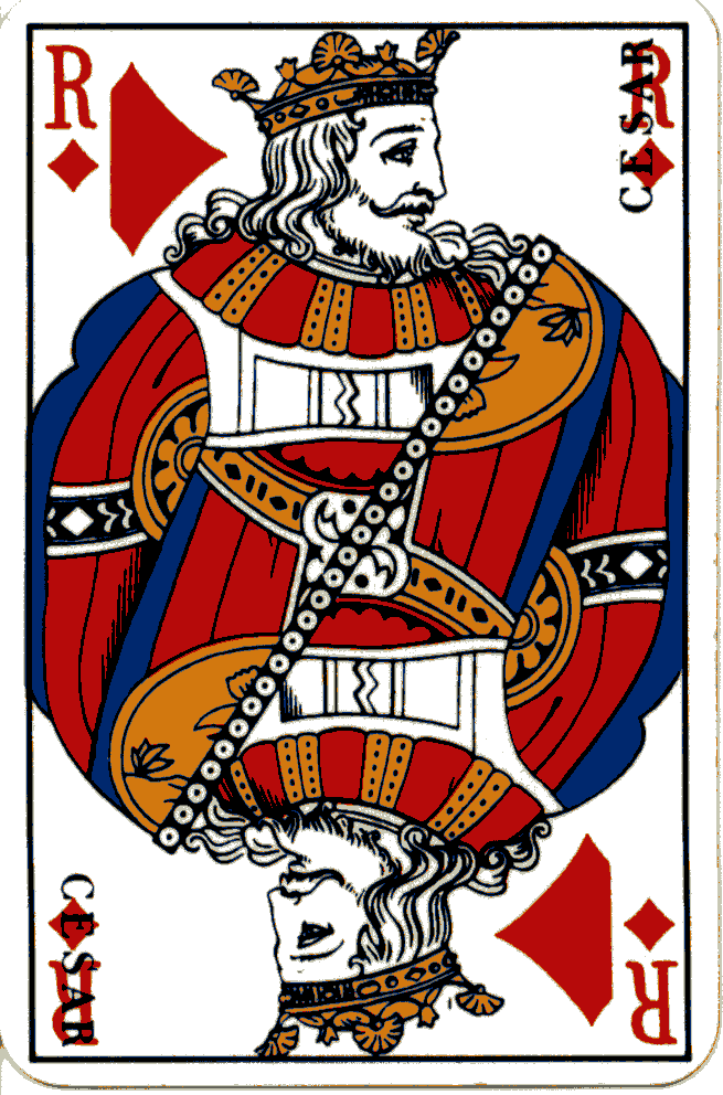 Called “César” on the French deck, probably after Julius Cæsar. He has no distinguishing attribute, and no visible hands. He faces right, and is seen in profile. On the English deck, he has an axe behind him, and one hand sticking in front of him. He faces left, and is seen in profile.