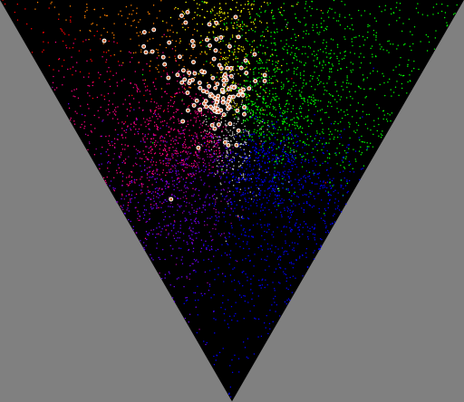 Il y a bien longtemps j'avais lancé une expérience où je demandais aux internautes francophones qui passaient par là de nommer par le premier nom, simple, qui vous semble naturel (par exemple rose, beige, gris…) une couleur tirée au hasard dans l'espace sRGB linéaire. Voici les nuages de points — projetés dans un triangle sRGB — pour certaines des couleurs les plus fréquentes (le nombre entre parenthèses est le nombre d'indentifications de cette couleur) :