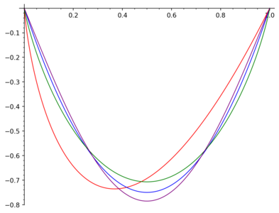 [#11b] Bon, puisque vous êtes apparemment du genre à lire les notes sur les notes, c'est que vous voulez vraiment les détails archi-précis, donc voici la normalisation que je fais : si (uφu) est un morphisme de (ℝ,+) vers le groupe des homéomorphismes croissants [0;1]→[0;1], de sorte que φ₀=id[0;1], si j'appelle G(u) la valeur 1 − 2∫φu(x)·dx (coefficient de Gini de φu), je reparamètre u (en le multipliant par une constante) de manière à avoir G′(0) = 1. Alors, avec cette convention, mes graphes sont tracés, dans chacun des trois cas, pour u allant de −½ à +½ par intervalles équidistants de 1/20. (Dans le premier cas (en rouge), γ = exp(2u), dans le second (en bleu), d = exp(3u), dans le troisième (en vert), e = (√π)·u, et dans le quatrième (en violet) a = exp((π²/4)·u).)